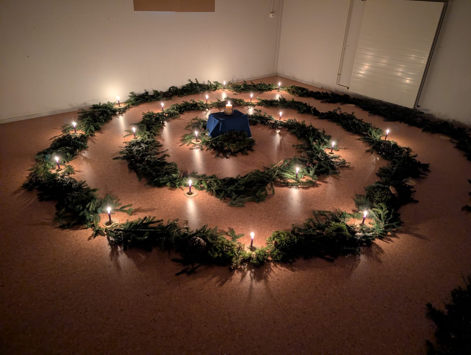 Die Kinder kamen in einen dunklen Raum. In der Mitte des Adventsgärtleins verströmte eine Kerze als einzige ihr Licht. Jedes Kind durfte an dieser Kerze sein eigenes entzünden und es auf die Spirale abstellen. So wurde es von Mal zu Mal heller – wie nach der Sonnwende, wenn die Tage wieder länger und lichter werden.